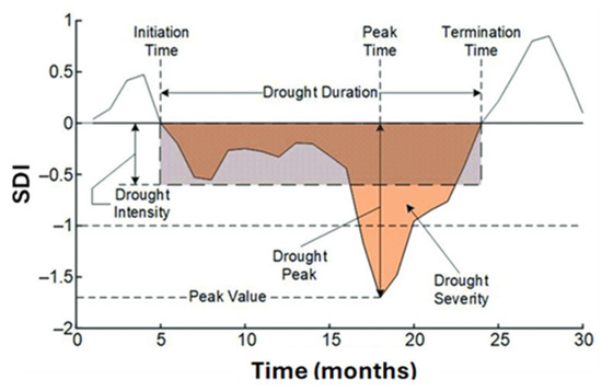The Theory of Runs (ToR) is a statistical method used to analyze drought characteristics [46], including drought event (DE), drought duration (DD), drought severity (DS), and drought intensity (DI) (Figure 3). DE is identified when the SDI value falls below a critical threshold. DD represents the duration of drought in months with negative SDI values, while DS is the sum of the absolute values of the SDI during a DE. DI can be defined as the absolute lowest value of the index (DI1) or the ratio of DS to DD in a DE (DI2).