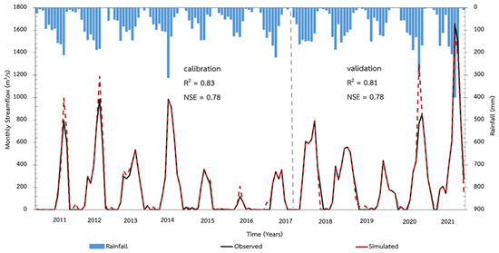 The monthly simulated and observed streamflow comparison for the M188 station during the calibration (2010–2017) and validation (2018–2021) periods. The two periods are separated by vertical dashed lines within the graphs.