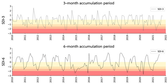 The temporal variation in the spatial averaged time series of the SDI in the LCKW at the 3- and 6-month time scales calculated based on the period of 2010–2021. The color scale from yellow to red represents mild to moderate, severe, and extreme drought categories, respectively.