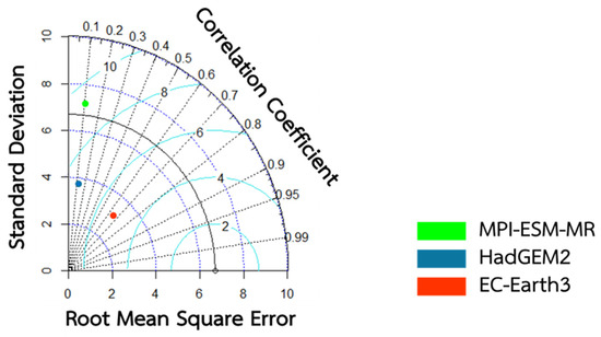 The data were processed to ensure consistency and accuracy before being used in Taylor diagram analysis. To create the Taylor diagram, data for 1992–2022 were used to assess how accurately the models predicted results compared with the observational data during that period, which were employed to assess the fit of these models. Among the models, the EC-Earth3 model (red dot) demonstrated the highest correlation with the observational data, with a correlation coefficient of 0.65, a standard deviation (SD) of 1.98, and a root mean square error (RMSE) of 3.41, making it the most accurate model. The HadGEM2 model (blue dot) also showed a strong correlation but had a higher RMSE. The MPI-ESM-MR model (green dot) exhibited moderate correlation and RMSE values (Figure 6).