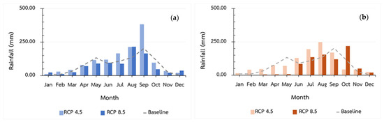 In 2029, in the RCP4.5 scenario, the annual streamflow is projected to be 3623.09 m3/s, with the highest flow value occurring in October (1495.52 m3/s) and the lowest one in February and March (0.13 m3/s). The monsoon season is expected to contribute 86.97% (3150.93 m3/s) of the total streamflow, with the dry season contributing 13.03% (472.17 m3/s), indicating a 34.74% increase compared with the baseline period. In the RCP8.5 scenario, the streamflow is projected to decrease to 1692.38 m3/s, with the highest flow in October (708.20 m3/s) and no flow in February and March. The monsoon season is expected to contribute 85.10% (1440.29 m3/s) of the total streamflow, with the dry season contributing 14.90% (252.09 m3/s), representing a 37.06% decrease compared with the baseline period (Table 6).