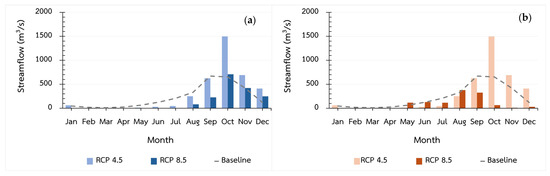 A comparison of streamflow between the baseline period (2004–2022) and the projections for 2029 (a) and 2039 (b) in the RCP4.5 and RCP8.5 future climate scenarios.