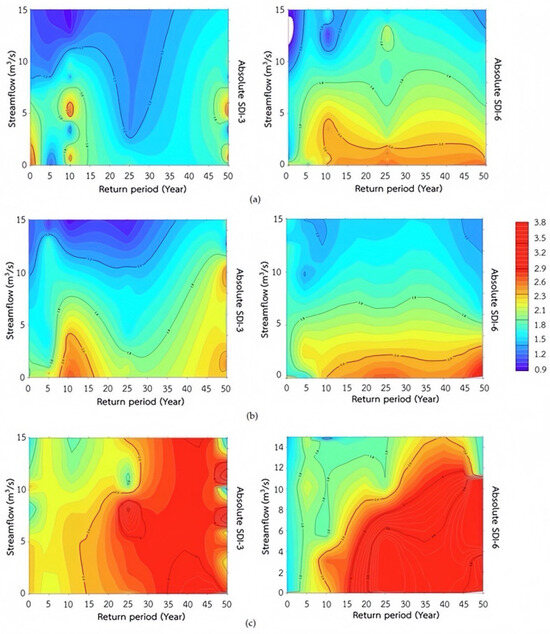 The streamflow drought index (SDI) is a key tool for assessing hydrological drought severity, where positive values indicate wetter conditions, and negative values signal the presence of drought. Calculated using monthly streamflow data, the SDI aids in managing drought and water scarcity across various time frames, encompassing both dry and wet seasons [44]. Specifically, the SDI-3, which tracks drought over a 3-month period, is particularly valuable for monitoring agricultural droughts and their impact on crops, whereas the SDI-6, calculated over 6 months, offers deeper insights into hydrological droughts that affect both surface and groundwater resources [45]. By analyzing both SDI-3 and SDI-6 together, a more comprehensive understanding of drought conditions can be achieved across both short-term and long-term time scales. Moreover, these time scale choices can be further refined depending on the specific climate and water resource focus of the study area, as detailed in Equation (8) [44].