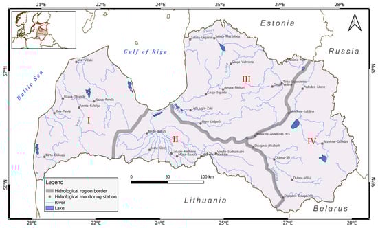 Map showing the location of hydrological stations and drainage regions: I—Western; II—Central; III—Northern; and IV—Eastern. The background information used for the map was obtained from the Latvian Geospatial Information Agency. The map was developed using the open-source software QGIS3.34.