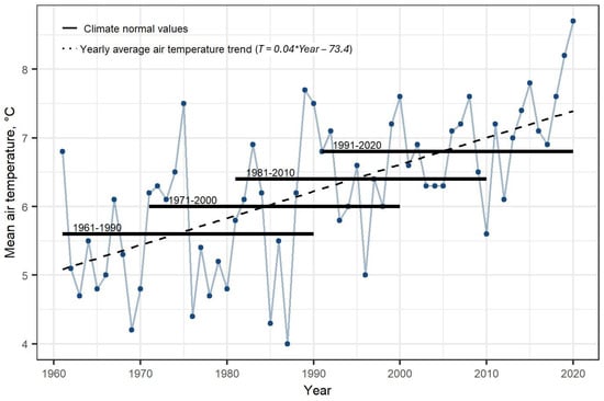 Recent studies [,] provide compelling evidence for ongoing climate change in Latvia. This is demonstrably reflected in the altered air temperature distribution observed during preceding climatological standard normal periods (1971–2000; 1981–2010) or the standard reference period (1961–1990) (Figure 2).