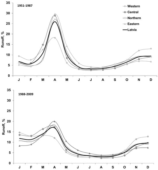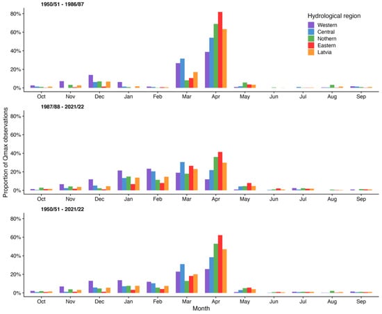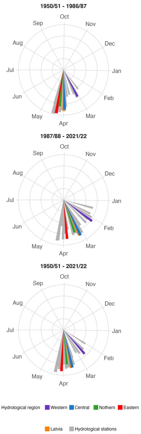 Historically, spring flood in the Baltic region is usually a combination of snowmelt and rainfall, with dominant snowmelt contribution where the maximum discharge is many times higher than the average annual discharge of rivers []. Using a mathematical calculation approach, our study found that in the sub-period 1950/51–1986/87, in all hydrological regions and in Latvia as a whole, the annual Qmax was most frequently observed in April (Table 2, Figure 3). The lowest percentage of Qmax observations in April is in Western HR (i.e., 39%), but the percentage increases from West to East. The overall situation changes in the sub-period 1987/88–2021/22, when the annual Qmax is most frequently observed in February in the Western HR, in March in the Central HR, in April in the Northern and Eastern HRs, and in April in Latvia as a whole. It should be noted that similar results were obtained when analyzing changes in distribution of total annual river runoff contributed by Apsīte et al. []. The occurrence of the annual Qmax is therefore earlier than in the past, when strong winters in mid-latitudes were more typical and spring runoff was more dominated by snowmelt inflows. It should be noted that the shape of the hydrograph has also changed: while there used to be one relatively strong peak discharge in March or April, there are now several lower peaks in winter and early spring months.