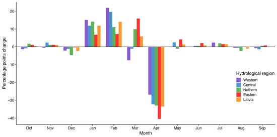 Percentage point changes in the distribution of the number of Qmax observations per months comparing years 1987/88−2021/22 to years 1950/51−1986/87 per hydrological regions and in Latvia.