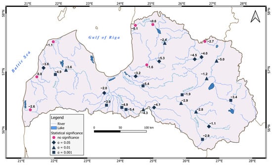 The study revealed that in Latvian rivers the annual Mmax of floods trend values were mostly negative, i.e., a decrease in flood magnitude and statistically significant. Trend values vary from −0.1 (Salaca-Lagaste HMS, very close to the Baltic Sea) to −5.4 (Ogre-Lielpēči HMS) Ls−1 km−2 decade−1. For ten rivers, the HMS trend value is equal to or greater than −4 Ls−1 km−2 decade−1 and the change is statistically significant. These HMS are mainly located in the Central and Northern HR and indicate the largest changes in Mmax magnitude. This is also shown by the calculated average trend value for the regions. The largest is for Central HR (−4.1 L/s−1 km−2 decade−1) and Northern HR (−3.0 Ls−1 km−2 decade−1), but the lowest is in Western and Eastern HR, −2.2 and −2.6 Ls−1 km−2 decade−1, respectively. In Latvia, the mean trend value is −3 Ls−1 km−2 decade−1. This indicates that relatively less hydro-climate changes have occurred in the Western and Eastern HR rivers, which have the highest (R) and lowest (A) Baltic Sea influence, respectively. However, one HMS Rīva-Pievīķi in the Western region has a trend value of 0.8 Ls−1 km−2 decade−1, but no statistically significant long-term change. This river basin is small by area (231 km2). This shows how hydro-climatic processes in small river basins can be more intense and different from changes in large river basins. Two river stations of the Western HR (Bārta-Dūkupji and Irbe-Vičaki) and four river stations of the Northern HR (Gauja-Sigulda, Vaidava-Ape, Salaca-Lagaste and Salaca-Mazsalaca) have negative trends without statistical significance. The remaining stations (77% of the rivers studied) have negative, statistically significant trends in annual Mmax at α < 0.05 confidence level. The results of the Mann–Kendall test reveal (Figure 7) that for all rivers studied the annual Mmax trend is negative, except for the Rīva-Pievīķi station.