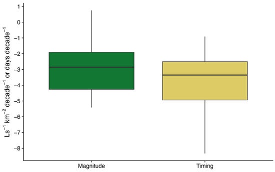 Box-plot of Theil–Sen slope in Ls−1 km−2 decade−1 for Mmax magnitude and days per decade for Qmax timing for stations (n = 30) showing trends across Latvia.
