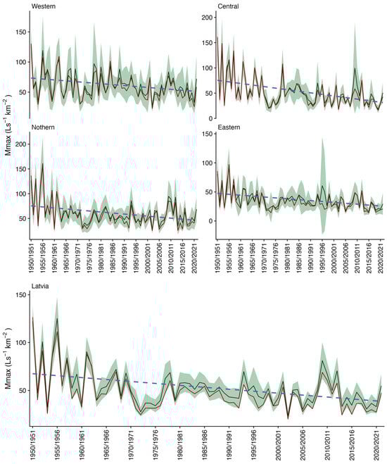Long-term temporal changes in annual Mmax of floods in four hydrological regions and across Latvia in the study period of 1950/51–2021/22. Green lines present Mmax mean values and red lines present median values over the entire drainage region and across Latvia. The green area represents 95% confidence interval for the mean annual Mmax values of the hydrological year. Blue, dashed lines present the linear trend.