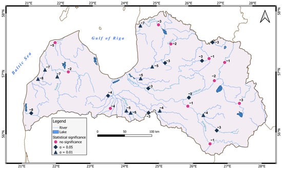 We also determined the direction and statistical significance of trends by using the nonparametric block bootstrapped Mann–Kendall (MK) trend test [], which is robust against outliers, distribution-free and is more powerful with non-normally distributed data. Block bootstrapped test version was used because part of the time series showed significant serial correlation. This method has been used in many streamflow trends analysis [,] (especially in Europe) []. Finally, the Walker test [] was used for testing the regional and total Latvia significance of any monotonic trends. The α < 0.05 level was used for critical significance.