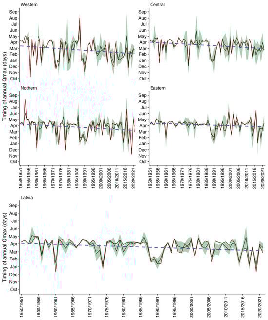 Long-term temporal changes in timing of annual Qmax in four drainage regions and across Latvia in the study period of 1950/51–2021/22. Green lines show mean values and red lines show median values timing across drainage regions and the country. The green area represents a 95% confidence interval for the mean timing values of the hydrological year. Blue, dashed lines show a linear decreasing trend.