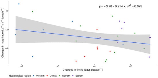 Relationship of trends in magnitude of annual Mmax and changes in timing of annual Qmax. Negative values in timing indicate early changes. The grey area represents 95% confidence interval for the period of 1950/51–2021/22.