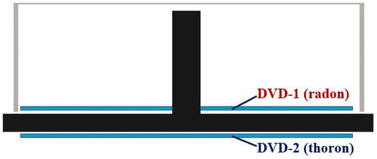 The passive monitor uses a spindle designed to hold 25 DVDs (spindle height 4 cm), as shown in Figure 1 and reasoned in [19]. Inside the spindle, one DVD (DVD-1) is fixed on the base with its inner surface facing inward. The spindle acts as a large “radon diffusion chamber,” where radon permeates through small gaps at the junction between the casing and the base. At equilibrium, the radon concentration inside the spindle is almost equal to that in the ambient air, while the thoron concentration is only a few percent of the ambient thoron concentration. Another DVD (DVD-2) is fixed outside the spindle (Figure 1) with its inner surface exposed to the exterior environment.