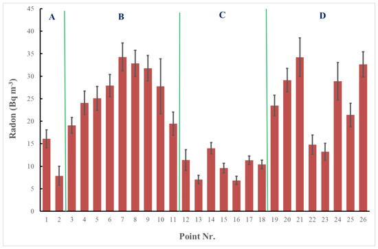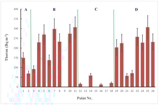 The distribution of the average activity concentrations of 222Rn over the exposure period at all 26 points is shown in Figure 2, and that of 220Rn in Figure 3. Four of the thoron DVDs (DVD-2), which were placed outside the spindles, were lost or damaged during exposure and could not be analyzed. In these cases, for 222Rn determination the average DVD-2 signal for the corresponding zone was used in data processing. The four different regions of measurements are indicated, and the data are summarized in Table 1.