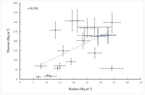 What is visible in Figure 2 and Figure 3, as well as in Table 1, is that regions with relatively higher radon concentrations also show higher thoron levels. Therefore, a correlation between radon and thoron was explored. As seen in Figure 4, there is a weak but statistically significant correlation between radon and thoron for the entire dataset (r = 0.559). A correlation between radon and thoron has also been observed in other studies of their outdoor levels [33], but not indoors [16] or in mines [31].