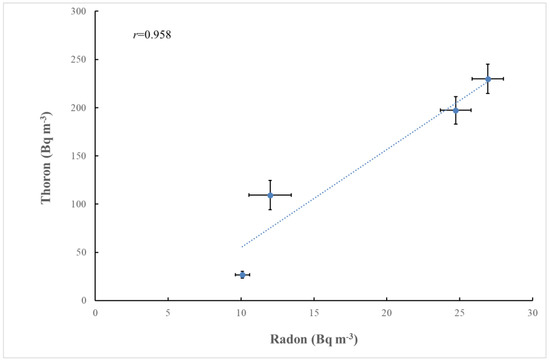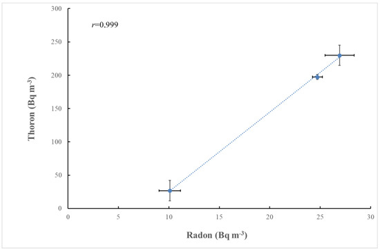 Radon–thoron correlation between the averages of zones B–D. Zone A is excluded, being statistically weak (only 2 points). The correlation becomes practically perfect. The Pearson’s coefficient of correlation (r) [30] is given.
