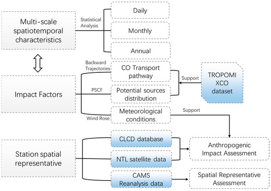 In this study, the first continuous observations of CO at DMS were analyzed to assess spatiotemporal characteristics and impact factors. Furthermore, CAMS (The Copernicus Atmospheric Monitoring Service Reanalysis Data) was applied to aid in quantifying the spatial representation of the regional background station. The flowchart of this study is as follows (Figure 1).