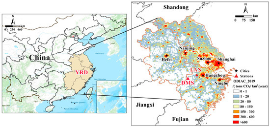 Left: The location of the YRD region in China. Right: The distribution of metropolises and the location of DMS and LAN in YRD. The base map on the right was from the Open-source Data Inventory for Anthropogenic CO2 (ODIAC) data in 2019, downloaded via https://db.cger.nies.go.jp/dataset/ODIAC/ accessed on 14 August 2024.