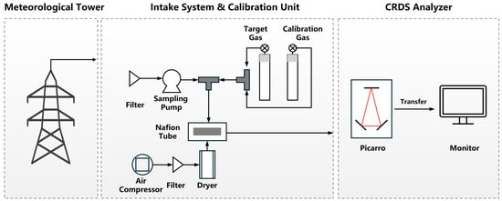 Atmospheric CO was observed continuously by a cavity ring-down spectrometer (G2401, Picarro, Inc., Santa Clara, CA, USA) at DMS from September 2020 to January 2022. Figure 3 shows the workflow of the measurement system at DMS. The ambient air was pumped into the instrument by a vacuum pump (N022, KNF Neuberger, Freiburg im Breisgau, Germany) for analysis through a 10 mm O.D. sampling line (Synflex 1300 tubing; Eaton, OH, USA) positioned 10 m above ground level outside the experimental square cabin (Figure 4). The air was then directed to a glass trap (MC480D1, SP Industries, Warminster, PA, USA) submerged in a methanol bath at −50 °C and dried to a dew point of approximately −35 °C.