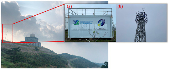 DMS at the hilltop flat. (a): Experimental square cabin on the summit of DMS; (b): a 10 mm O.D. sampling line outside the experimental square cabin at the top of a 10 m tower.