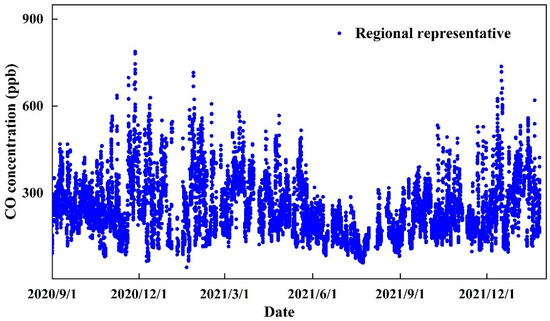 A rigorous quality control process of all observation records was conducted prior to the data analysis. The data marked with equipment failure or instrument maintenance were first excluded for further analysis. After the quality control process, the data were averaged by hours, and there were consequently 10,361 pieces of hourly CO records (92.8% of the total records), also flagged as regional representatives at DMS in this study. And 801 pieces of hourly CO records (7.2% of the total) were excluded due to outliers from instrument calibration and malfunctions. Figure 5 shows the filtered regional CO concentrations at DMS during the study period. The high values of CO concentration were mainly distributed in spring and winter, with lower values of CO concentration in summer.