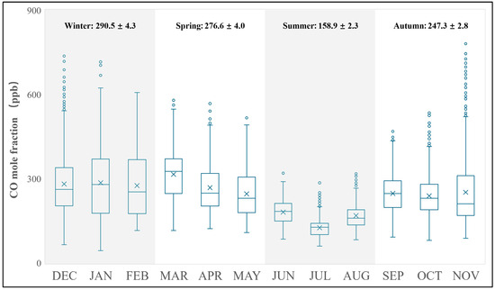 Figure 6 shows the monthly variations of CO concentrations to better understand the seasonal characteristics of CO at DMS. The highest seasonal CO concentrations were 290.5 ± 4.3 ppb observed in winter (DJF: Dec., Jan., Feb.), followed by 276.6 ± 4.0 ppb observed in spring (MAM: Mar., Apr., May.), 247.3 ± 2.8 ppb in autumn (SON: Sep., Oct., Nov.), and the lowest CO concentrations were 158.9 ± 2.3 ppb observed in summer (JJA: Jun., Jul., Aug.). Similar seasonal CO cycles have been reported in many other sites in the NH, such as Gosan [45], LAN [7], and Akedala [44].