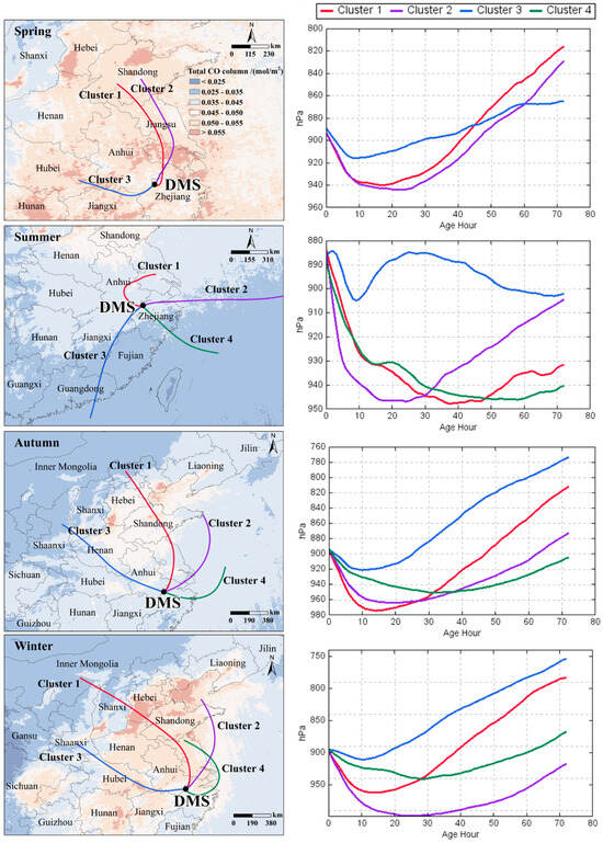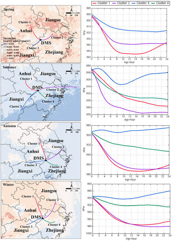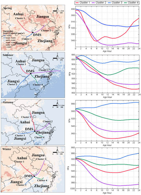 Left: Cluster analysis of 1-day back trajectories for the most significant concentration enhancement period of the whole day (14:00–19:00 LT in spring, 16:00–22:00 LT in summer, 16:00–20:00 LT in autumn, 14:00–19:00 LT in winter) at DMS. Right: The average pressure changes corresponding to each cluster. The colorful lines on the map are cluster analysis results with base maps of average column CO concentration retrieval from TROPOMI products.