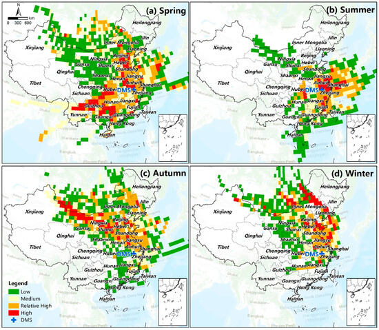 Geographical distributions of seasonal weighted potential sources of CO from 2020 to 2022 at DMS. The higher WPSCF represented the higher contribution from the areas to the CO concentration at DMS. The WPSCF were reclassified by Natural Break as low (<0.2), Medium (0.2–0.4), Relative-High (0.4–0.6), and High (>0.6) for better performance.