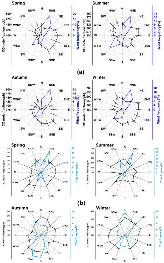 Predominant surface wind directions varied throughout the year at LAN and DMS. As shown in Figure 12a, the CO concentrations at LAN strongly depended on surface wind direction, with notable variations observed across different wind directions. Higher CO concentrations were observed when the winds came from the ENE-E-ESE-SE-SSE sectors. Conversely, lower concentrations were observed in the NNE and SW sectors, which had the largest wind frequencies [17]. This dependency on wind direction suggested that the CO transport from specific local sources associated with prevailing wind patterns influenced the observed CO concentration at LAN. According to Figure 12b, the average CO concentration distribution displayed a uniform pattern across 16 wind directions at DMS, except for a comparatively lower value observed in the WSW sector during summer. The winds from NNW, NNE, and N relatively prevailed in spring, summer, and winter, whereas those from S and SSW prevailed in autumn. The uniform CO concentration pattern across all wind directions indicated a narrow range of average values throughout the measured periods. Also, this suggested that compared to LAN, the atmosphere at DMS exhibited a well-mixed condition with a relatively consistent concentration across various wind sectors within the same season. Based on Figure 13, the CO concentrations at DMS did not exhibit a significant dependency on surface wind direction and wind speed, and no significant reliance was found between the concentrations and wind frequency at DMS. Indeed, those were the fundamental conditions for a well-regional representative observation, ensuring that the data collection accurately represented a larger region under consideration. Combined with Figure 11, the potential source areas extensively covered the most YRD areas. Hence, the wind-rose maps consistently supported that the CO observed at DMS could represent the atmospheric CO concentrations within the YRD well.