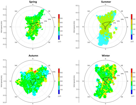 Figure 6 further implies the hourly average CO concentration data distribution for all seasons. In winter, the CO data (DJF) showed a much more extensive distribution than those of the other three seasons, particularly summer (JJA). The standard deviation of CO concentration in winter was 123.5 ppb, while that in summer was 44.2 ppb. However, similar characteristics were not found in long-term observations at LAN, and the summer distribution was not substantially narrower than that of winter [7]. Compared to LAN, the CO data at DMS showed better thoroughly mixed weather conditions and less impact from the local release sources during summertime (further analysis shown in Section 3.2 and Section 3.3). In contrast, the winter data may be more sensitive to different release sources, including local sources and long-distance transportation pollutants, due to the directional switch of the winter monsoons.