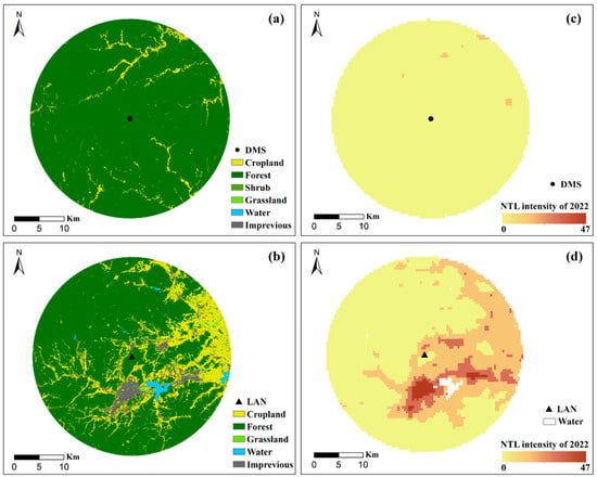 Annual CLCD in 2021 within a 20 km radius of DMS (a) and LAN (b) and NTL data in 2022 within a 20 km radius of DMS (c) and LAN (d).
