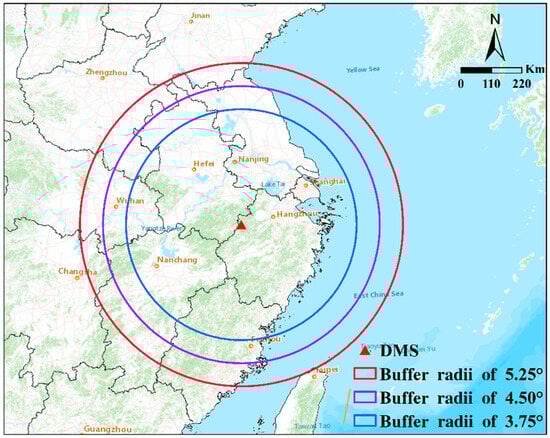 Centered on DMS, the buffer range with radii of 3.75°, 4.50°, and 5.25°.