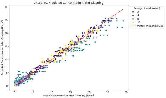 The scatter plot (Figure 1) shows the relationship between the actual and predicted particle concentrations after cleaning with data points color-coded by dosage speed.