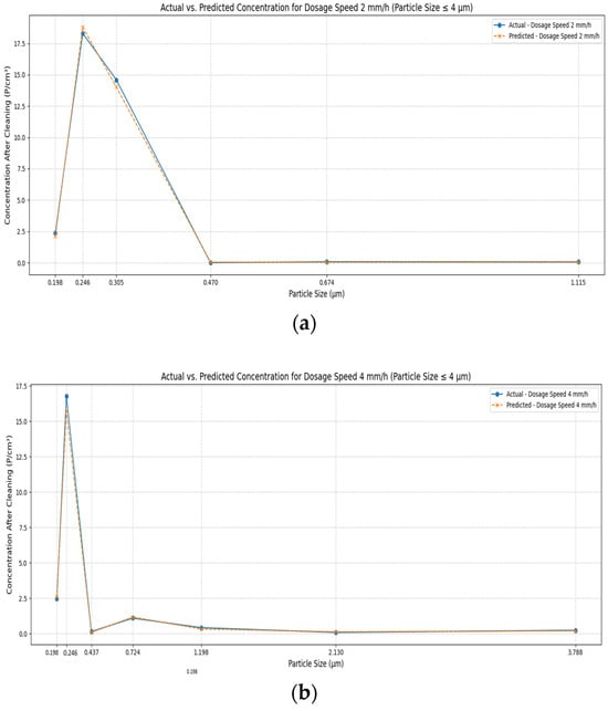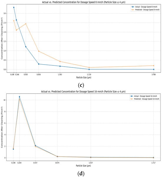Actual vs. predicted concentration after cleaning by particle dosage speed (a) 2 mm/h; (b) 4 mm/h; (c) 8 mm/h; (d) 16 mm/h.