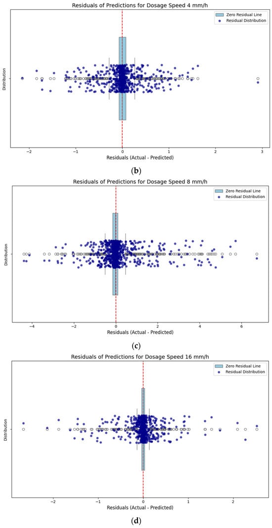 Residuals of predictions by dosage speed: (a) 2 mm/h; (b) 4 mm/h; (c) 8 mm/h; (d) 16 mm/h.