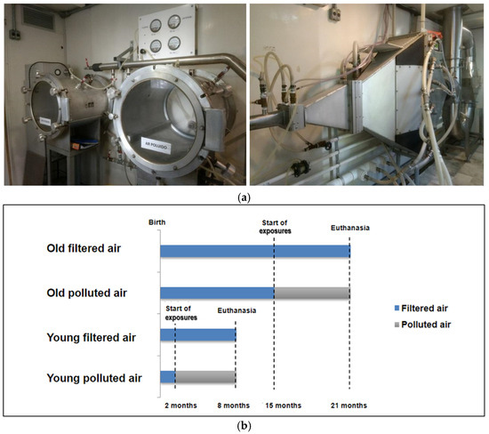 Ambient particle concentrator (APC) and representative scheme of the experimental protocol. (a) The APC consists of the filtered air (FA) and polluted air (PA) chambers (left), which are connected to the impactors that concentrate the particulate matter—PM2.5 (right). (b) Young groups with onset of exposure at two months old and older groups with onset of exposure at 15 months of age; all groups were euthanized six months after the start of the exposure.