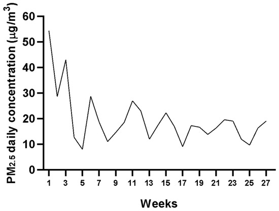 The exposures took place over a period of 132 days. During this time, on days when air humidity levels were high or it was raining, the exposures were not conducted, as these conditions caused pollutant concentrations to be very low. As a result, a total of 93 exposures were carried out, while 39 days (29.5%) had no exposures due to unfavorable weather conditions. This adjustment to the schedule was necessary to maintain optimal conditions to avoid interference with the results. The fine PM concentration was measured daily, and the weekly average of the values obtained was calculated, resulting in a weekly average concentration of 19.47 µg/m3 (Figure 2).