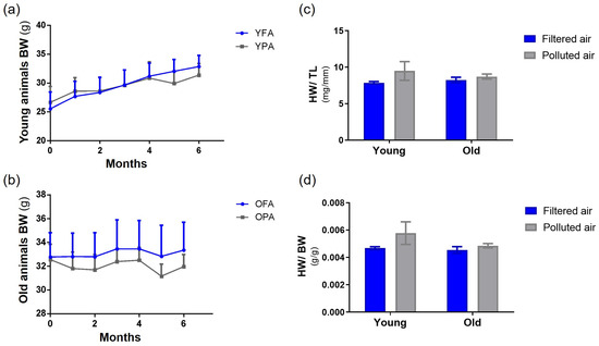 The body weight of both young and old mice was monitored over the six months of exposure to either filtered or polluted air. There were no significant differences in body weight between the groups exposed to filtered air (Figure 3a) and those exposed to polluted air (Figure 3b) during the same evaluated period, indicating that chronic PM exposure did not affect body weight.