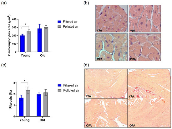 Myocardium remodeling evaluation. (a) Quantification (* p = 0.0094, n = 4 per group) and (b) representative images of cardiomyocytes area. Crops of entire original images were made to highlight and better represent the corresponding quantitative findings. (c) Quantification (* p = 0.0399, n = 5 per group) and (d) representative images of the myocardium used for fibrosis quantification. YFA: young filtered air; YPA: young polluted air; OFA: old filtered air; OPA: old polluted air.