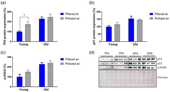 Analysis of protein expression of cellular senescence markers. Quantitative analysis of p53 (a), p21 (b), and phospho-histone H2AX (Ser 139) (c) in experimental groups. Representative image (d); YFA: young filtered air; YPA: young polluted air; OFA: old filtered air; OPA: old polluted air. * p < 0.05, n = 3–6.