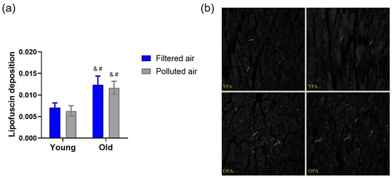 Lipofuscin evaluation. (a) Quantification and (b) representative images of myocardium histological sections used for lipofuscin proportion deposition. Arrows indicate evident lipofuscin in aged mice from both experimental exposure conditions. & p <0.01 vs. young filtered air group, and # p < 0.01 vs. young polluted air group, evaluated by two-way ANOVA.