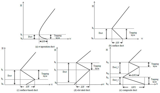 Typical modified refractivity profiles of lower atmospheric duct types distinguished in this study include (a) evaporation ducts, (b) surface ducts, (c) surface-based ducts, (d) elevated ducts, and (e) composite ducts; is trapping layer top height, is trapping layer bottom height, and is duct bottom height.