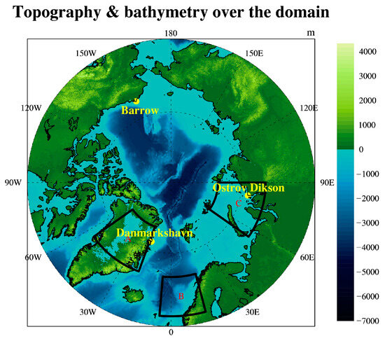 Topographic map of the domain used in the polar WRF model for this study. The locations of the three sounding stations for validation are marked with yellow dots. The three areas framed by black lines represent the typical regions selected for the subsequent statistical analysis, where A represents Greenland, B represents the Norwegian Sea, and C represents the Kara Sea.
