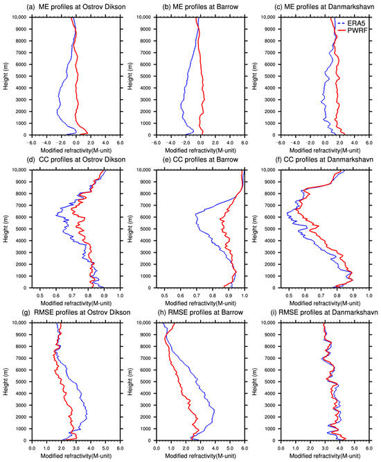 Mean error (ME) profiles of the modified atmospheric refractivity at (a) Ostrov Dikson, (b) Barrow and (c) Danmarkshavn radiosonde stations; the mean correlation coefficient (CC) profiles of the modified atmospheric refractivity at (d) Ostrov Dikson, (e) Barrow, and (f) Danmarkshavn radiosonde stations; and the root-mean-square error (RMSE) profiles of the modified atmospheric refractivity at (g) Ostrov Dikson, (h) Barrow, and (i) Danmarkshavn radiosonde stations. The red lines represent the PWRF results, and the blue dashed lines represent the ERA5 reanalysis data.