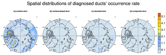 According to the duct diagnostics from the five-year simulation, the characteristics of Arctic lower atmospheric ducts were statistically analyzed. Figure 5 shows the multi-year mean spatial distributions of the occurrence rates for the four types of lower ducts defined in Section 2.2. In Figure 5a, the average occurrence rate of simple surface ducts across the entire region was 0.23%. Simple surface ducts were characterized by the modified atmospheric refractivity at the duct top being lower than at ground level. These ducts featured a duct layer that directly included a grounded trapping layer. As shown in Figure 5a, this type of duct mainly occurred in land areas surrounding the Arctic Ocean. The formation of simple surface ducts was likely driven by the development of cold high-pressure systems and local radiative cooling, which created temperature inversions. In terms of regional distribution, the occurrence rate of simple surface ducts was higher on land than over the oceans, and the rates were greater at lower latitudes compared with higher latitudes. The occurrence of atmospheric ducts was influenced by factors such as air temperature, humidity, sea surface temperature (SST), and air pressure. When changes in air pressure were minimal, variations in air temperature and humidity became the main factors determining the occurrence of atmospheric ducts. Many previous studies have found that the incidence rate of surface ducts over land was higher than that over the sea. The rapid changes in land surface temperatures contributed to the formation of a temperature inversion layer and significant changes in the humidity gradient due to local radiative cooling. In contrast, the temperature on the ocean surface, with its larger specific heat capacity, changed more slowly, and the humidity difference near the sea surface was smaller. The formation of surface ducts over the sea might be more dependent on regional air advection movements, with less influence from local factors, which could explain the lower incidence rate of surface ducts over the sea compared with land. As for elevated ducts, these occurred at relatively high altitudes and were less influenced by the underlying surface. They were mainly caused by weather activities. Therefore, the difference in distribution between the sea and land was not as pronounced as it was for surface ducts. Regarding the latitudinal variations in the incidence rate of ducts within the Arctic region, the key factors were the changes in the vertical gradients of air temperature and humidity. The closer to the North Pole, the more pronounced the influence of high polar pressure became. Under the influence of prevailing downdrafts throughout the year, the atmospheric stratification near the North Pole remained relatively stable, with minimal changes in the vertical gradients of air temperature and humidity, which thus inhibited the formation of ducts. In contrast, at lower latitudes, the temperature of the underlying surface was higher, and the vertical movement of air was more frequent, which made the occurrence of ducts more likely.