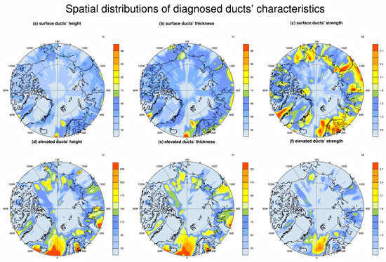 In the few studies on Arctic atmospheric duct characteristics, researchers have typically relied on single-station observations or reanalysis datasets for duct diagnosis and analysis. For example, Qin et al. [22] used the ERA–Interim reanalysis data from the European Centre for Medium-Range Weather Forecasts (ECMWF) to analyze the climatic characteristics and variations of atmospheric ducts in the Arctic from 1989 to 2018. Their findings revealed that the overall frequency of atmospheric ducts in the Arctic was relatively low, with surface ducts occurring two to three times more frequently than elevated ducts. Zhu et al. [23] analyzed the characteristics of atmospheric ducts in the Svalbard Islands in the Arctic using reanalysis data. They found that the surface duct occurrence rate was 12.6%, with an average intensity of 1.30 M and an average thickness of 13 m.