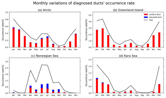 Monthly variation in the diagnosed duct occurrence rates in the (a) Arctic, (b) Greenland Island, (c) Norwegian Sea, and (d) Kara Sea. Red bars represent the occurrence rates of surface ducts, blue bars represent the occurrence rates of elevated ducts, and the line indicates the highest monthly occurrence rates.