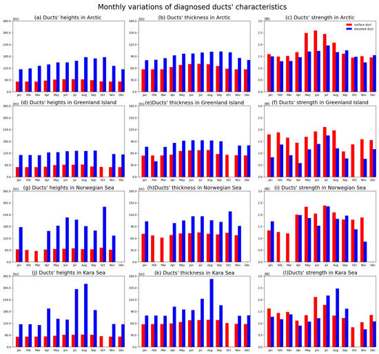 Monthly variations of the diagnosed duct characteristics, including (a) heights, (b) thickness, and (c) strength in the Arctic; (d) heights, (e) thickness, and (f) strength in Greenland Island; the ducts’ (g) heights, (h) thickness, and (i) strength in the Norwegian Sea; and the ducts’ (j) heights, (k) thickness and (l) strength in the Kara Sea. The red columns represent surface duct characteristics, and the blue columns represent elevated duct characteristics.