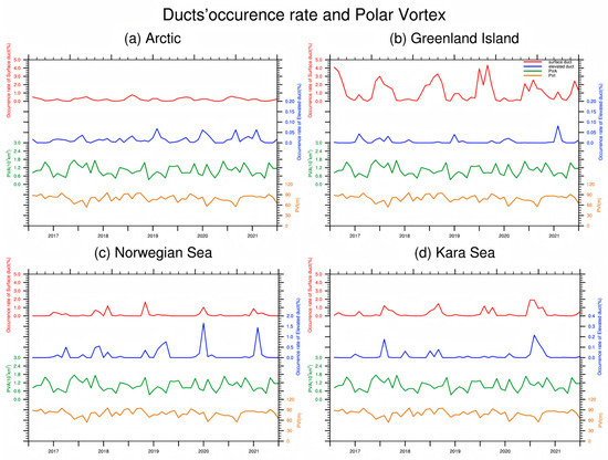 Monthly series of duct occurrence rates and polar vortex indices (PVI and PVA), including the series for (a) the Arctic, (b) Greenland Island, (c) the Norwegian Sea, and (d) the Kara Sea. The red and blue lines represent the occurrence rate series for surface ducts and elevated ducts, respectively. The green and brown lines represent the PVA and PVI indices, which are the same across all four subfigures.